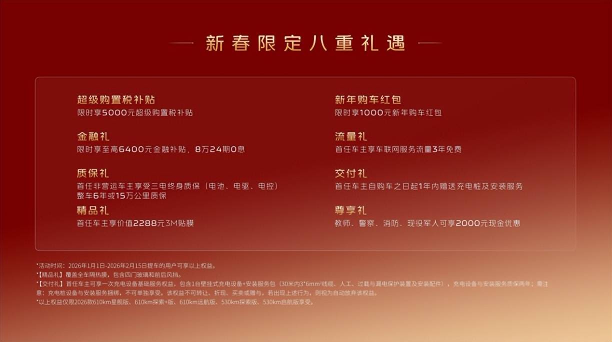 细节设计尽显贴心✿✿,洗车模式一键关闭车窗天窗✿✿、切换空调内循环✿✿,避免进水落灰✿✿;露营模式自动开启外放电✿✿,适配多元用车场景✿✿。新春购车福利加码圣衣神话交易所✿✿,限时5000元购置税补贴✿✿、至高6400元金融补贴及三电终身质保等八重礼遇✿✿,大幅降低入手门槛✿✿。